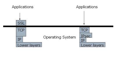Standards for real-time public key based security protocols include IPsec, SSL/TLS, and SSH. SSL/TLS and SSH are implemented at layer 4, whereas IPsec is implemented at layer 3. This is depicted in Figure 1.