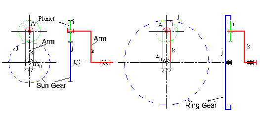 5.2. PLANETARY GEAR TRAINS In simple gear trains the axes of each gear was connected to the fixed link by revolute joints. A gear train is called a planetary gear train if there are some gears whose axes are not fixed. The velocity ratio between the rotating links will be different than the gear ratio. They can produce large changes in speed using very few gears. They are used in differentials, computing devices, in automatic car transmission and in a variety of instruments where a high speed ratio between the input and output is required within a small space (i.e. in heavy duty tractors, hoists, screw drives etc) and/or when a speed change without disengagement of the input and output (i.e. automatic gear boxes) is required. The simplest form of a planetary gear is as shown. The arm (link k ) can rotate about A0. Link j (which is called sun gear, if external or ring gear, if internal) is also connected to the fixed link by a revolute joint at Ao. Link i, which is called the planet gear, is connected to the arm at A by a revolute joint, and links i and j are gear paired. (In the schematic representation of planetary gear trains side view is usually preferred.)