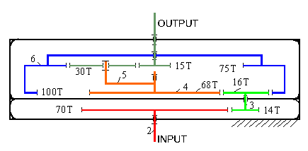 A speed changer is shown. The input speed is 1800 rpm. Determine the output speed and state its relative direction of rotation with respect to the input link. In the first portion of the gear train (links 2, 3, 4 and 6) the gears have a fixed axis of rotation. Therefore: