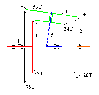 Consider the planetary gear train shown. We can write the gear ratio between links 1 and 4, when the arm (link 2) is considered fixed as: Noting n11 = 0, we obtain: Example . The gear train shown (schematically) below is known as "Humpage's bevel gear differential" link 2 is the input and link 4 is the output. We would like to determine the speed ratio N24 Considering the gear train 2, 3 and 1, link 3 is the planet and link 5 is the arm. Hence: