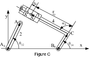 Again there are 3 variables (12, 13 and s14) one of which must be specified as the input. In this case the vectors AoA and AB have fixed magnitudes and varying directions. The vector AoB has a fixed y component (length c) and a changing x component (s14). Depending on the applications either 12 (i.e. in pumps) or s14 (i.e. internal combustion engines) is the input.In complex numbers the vector loop equation will be: