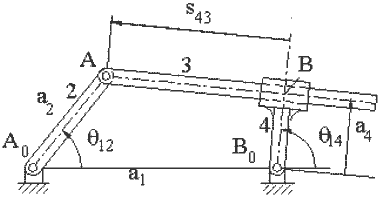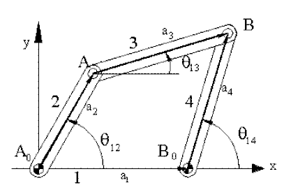 Where the plus or minus sign refers to two different configurations of the four-bar mechanism. Also note that the coefficients of the quadratic (A, B and C) are functions of the link lengths and the input crank angle only. Therefore, if the input crank angle is given, q 14 can be obtained from equation (10) directly.