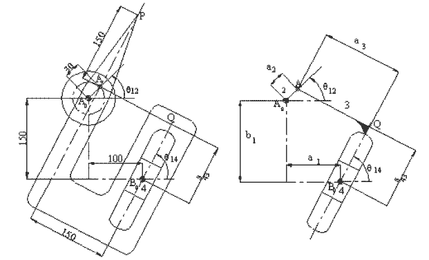 In case of the analytical solution, the main problem is the identification of the loop and the position variables. If we redraw the mechanism as in figure (b) below, the identification of the position variables may be more obvious. The most important rule is that one must disregard the shape of the links and concentrate on the joints involved. In such a case we can write the loop equation in complex numbers as:
