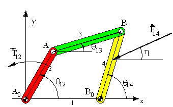 If the displacement analysis is performed beforehand, e.g. if q13, q14 values are determined for different q12 values, the above equations can be used for every position of the mechanism. Another important point is that this formulation is very general. It can be used for mechanisms where there are several external forces acting on the same or different links and in cases where we have resisting forces at the joints. However, the resulting number of equations is usually too large (if there are l links in the mechanism there will be 3(l-1) equilibrium equations).