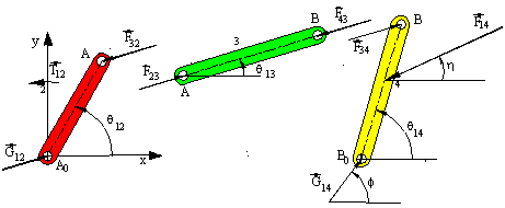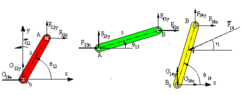 In this case to simplify the calculations we note that Fij = -Fji for the joint forces. Furthermore, since link 3 is a two-force member, F23 and F43 are equal, opposite and their line of action is along AB. Hence F23 =F23 <q13, and q13 is known from the kinematic analysis. Also link 2 is a two-force plus a moment member. Therefore: