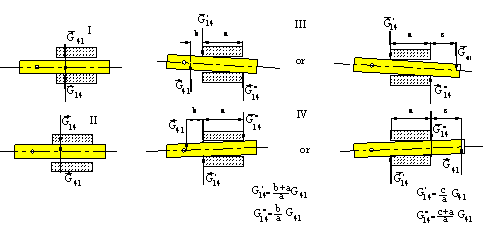 The force G14 can be placed anywhere on link 4. Since link 4 is in static equilibrium, this will change the magnitude of the moment M14 . If the line of action of G14 passes through the point of intersection of F14 and F34 , the moment M14 will be zero and rigid body will be in equilibrium under the action of three forces.If the point of concurrency, O, of the three forces lie within the physical boundaries of the sliding joint, there will be surface contact between links 1 and 4. (In the figure the contact is at the bottom surface, If the direction of G14 is downwards instead of upwards, contact will be at the top surface) and link 4 will not be subjected to a rotary motion within the slide. However, if the point of concurrency, O, lies outside the boundaries (b), the force G14 is a fictitious force which is the resultant of the forces acting at the contact region (Due to equilibrium under the action of the three forces: G14 +F34 +F14 =0).