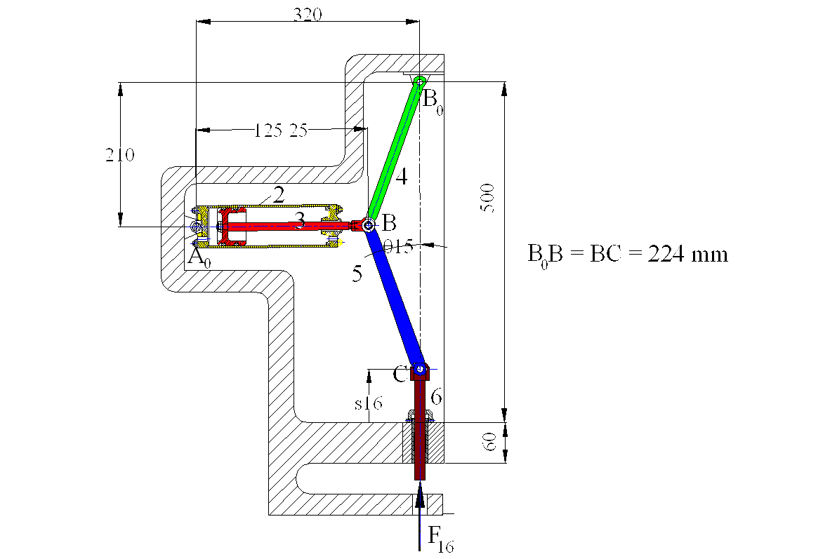 Consider the pneumatic press shown. It is a six link mechanism. The force F16 applied by the work piece onto the ram (link 6) is brought to equilibrium by the pneumatic pressure applied to the piston and cylinder.