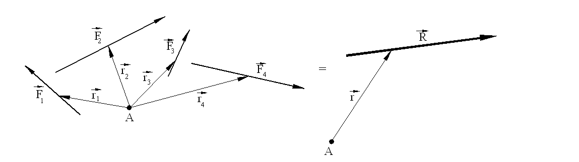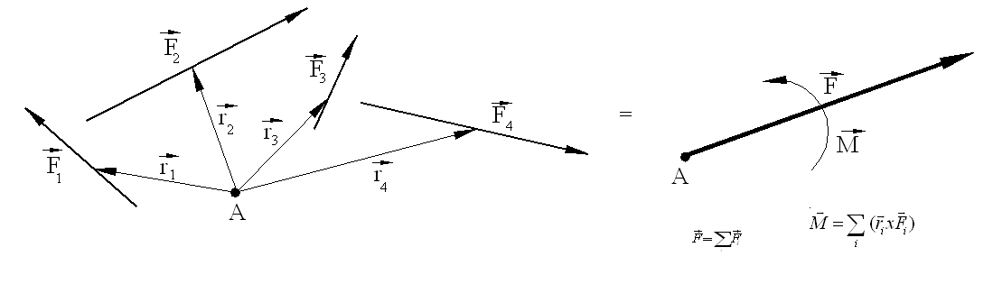 The resultant, F, is as if the forces were concurrent at a point. However, there is also a moment M acting at the particular point considered. The system of forces can further be reduced to a single force, R, provided that the moment of this force about an arbitrary point is equal to the moment of the system of forces, e.g., where r and ri are the position vectors of the resultant and the forces from an arbitrary point A