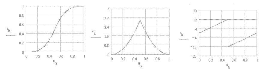 Cubic #1 curve is the combination of two third order curves. There is no abrupt change at the start or the end of the cycle, but there is an infinite slope on the acceleration curve at the midpoint of the cycle, which is not advantageous. The curve is not very practical. The equations for the displacement velocity and acceleration are: