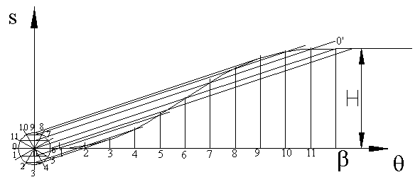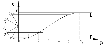 If a circle rolls along a straight without slipping, a point on the circumference traces a curve that is called a cycloid This curve can be drawn by drawing a circle with center C on the line OO’. The circumference of the circle is equal to the total rise; or the diameter is H/p .The circumference is divided into a number of equal parts corresponding to the divisions along the horizontal axis. The points around the circle are first projected to the vertical centreline of the circle and then parallel to OO’ to the corresponding vertical line on the diagram (Fig. 8.18).