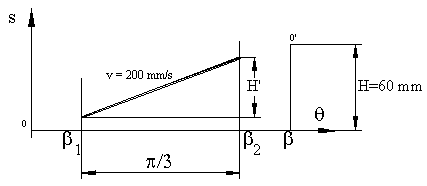 The rise motion is composed of three parts. Within the crank rotation 0<q<q1 we have constant acceleration (or parabolic) motion, within the range q1 < q < q2 we have constant velocity (or straight line) motion and within the range q2 < q < b we have constant deceleration (parabolic) motion curves. Angular velocity of the cam is given as w=50*p/30 = 5.238 s-1, therefore p/3 cam rotation will take place within Dt= 0.2 s. If the speed of the follower is kept at 200 mm/s during this phase of the motion, then the amount of rise with constant velocity is H’=200*0.2= 40mm. During the acceleration and deceleration periods total rise will be 20 mm. If we assume the rise for each constant acceleration periods is equal than there will be 10 mm rise for each interval. Note that the amount of crank rotation is not known for the constant acceleration periods.