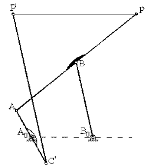 The given procedure locates both the orientation and the lengths of the links for all the four-bar cognates. A simpler construction for determining the link lengths is to stretch the four-bar mechanisms such that A0ABB0 lie on a straight line, since the theorem is also valid for an immovable four-bar with a new fixed link length a’1=a2+a3+a4. Application of the above steps to such a configuration for determining its cognates is quite simple as shown in the figure. One can then determine the location C0 of the original configuration by noting