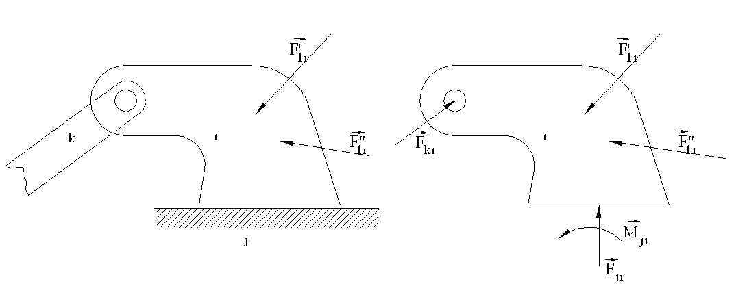 In machine systems there are several rigid bodies. A free-body diagram is a sketch of a rigid body or a group of rigid bodies in which all the forces and moments acting on the rigid body are shown. Note that a free-body may involve one link, several parts of a machine or the whole machine. In the free-body diagram both the known forces and the unknown forces are sketched. This diagram need not be in a certain scale, but neatness in such diagrams is essential for a clear understanding. As an example, consider a rigid body, i, as shown. It is connected to other rigid bodies. In the free-body diagram of link i, this body is isolated from other rigid bodies and all the forces (reaction forces, Fki, Fji, Mji ; external forces Fli’, Fli “) are shown. If the magnitude and/or the direction of a force is known, it is indicated.