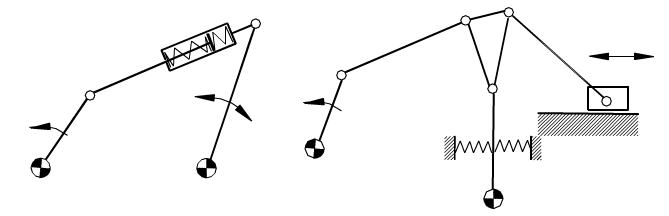 Above, two other examples for unconstrained mechanisms is given. One of the fredoms of the mechanism is usually controlled by a continuous motion. The other freedom is usually controlled by a spring and a key (not shown in the above examples). The motion is governed by both the continuous input plus the force or moment acting on the links under the spring force. |