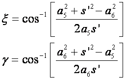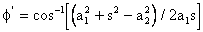 Similar to the method used in geometrical analysis, first consider the triangle A0AB0. Since the two sides (a1, a2) and the included angle (q12) are known, for this triangle the length of the third side (AB0 = s) and angle f of the triangle can be determined. Note that the length, s, and angle f are variable. Using the cosine theorem:
