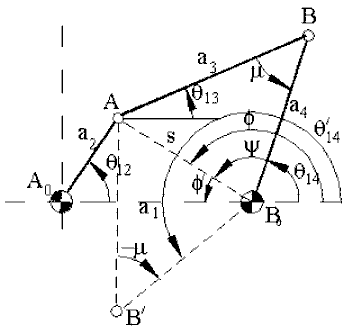 Noting that the links 1,2,3,4 (A0ABB0) form a four-bar mechanism, referring to the equations derived for the four-bar: