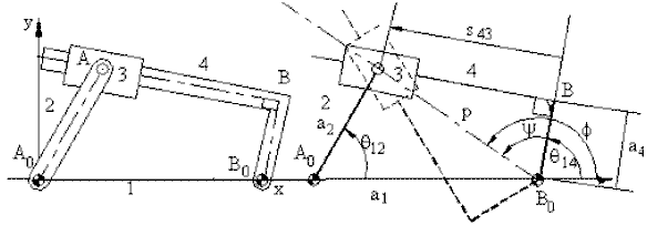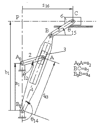 In great many mechanisms, the stepwise solution will require the solution of four-bar, slider-crank or inverted slider-crank loops in steps. For example, the quick-return mechanism shown below links 1,2,3 and 4 form an in-line inverted slider-crank mechanism while links 1,4,5 and 6 form a slider-crank mechanism. For a given value of the input variable, q12, the angle q14 and s can be determined. In case of the slider-crank mechanism, with q14 as the input variable, the position variables q15 and s6 are found. In such an analysis, one must be concerned with the reference axes and how the variables are to be measured with respect to the reference axes.