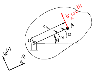 When the body is in a rotation, q is the variable angle and is a constant length. In this expression r A is the magnitude and eiq is a unit vector in the direction of OA. Differentiating the position vector, we obtain: