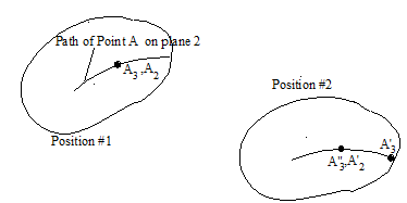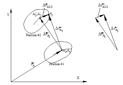Consider plane 2 moved from position #1 to another position #2. During this time a point A3 that is coincident with A 2 at position #1 but on a different plane, moves to position A’ 3 while A 2 moves to A’ 2 . Points that were instantaneously coincident in position #1 are not coincident at position #2. However, the path of on link 2 is known. The motion of point A 3 can be regarded as the sum of translation with A 3 to A” 3 that is coincident with A’ 2 and a relative motion from A” 3 to A’ 3 relative to the plane 2. Hence, as shown below, point A 3 first moves by a distance Dr A2 with A 2 and then moves by a distance Dr A3/2 relative to A 2 . The order of the two superimposed motions is not important.