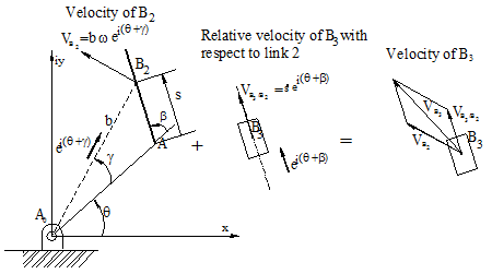 The first term has the magnitude w|A0B|= wb and its direction is perpendicular to the line A0B since the unit vector is ie i(q+g) . The second term has the magnitude which is the relative velocity of point B3 with respect to link 2 and its direction is along the slider axis AB given by the unit vector e i(q+b ).