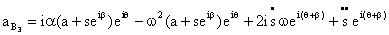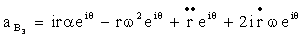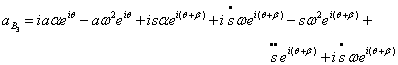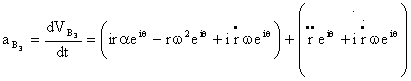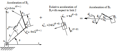 The first two terms are the tangential and normal acceleration components of point B2 whose direction are normal and parallel (directed towards A0) to the line A0B respectively . The third term is the relative Coriolis acceleration which is perpendicular to the slider axis AB (given by the unit vector ie i(q+b) ). The last term is the tangential relative acceleration with magnitude and direction e i(q+b) which is along the slider axis AB. Therefore in vector form the acceleration of B3 is: