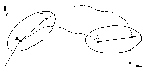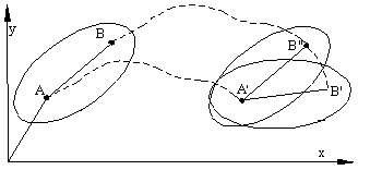 Consider a plane represented by two points AB. Finite displacement of the rigid body from position 1 to position 2 at a time interval t can be regarded as the sum of the translation from AB to A’B” and a fixed axis of rotation about an axis perpendicular to the plane and passing through A’. One can also achieve the same final motion by translating from AB to A”B’ and then rotating about an axis passing through B’, or one can first perform a rotation about an axis perpendicular to the plane and passing through any point on the rigid body and then perform the translation. The actual paths of points will of course not correspond to the paths described by these different combinations of rotations and translations, but the final position can be reached and when the two positions are infinitesimally close these motions will coincide with the instantaneous paths of the points on the rigid body.