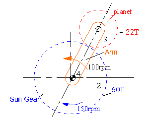 Therefore: As a simple example, consider an epicyclic gear train shown below. The sun gear has 60 teeth and the planet has 22 teeth. The arm rotates at 100 rpm counter clockwise and the sun gear rotates at 150 rpm clockwise. Denoting the counter clockwise rotation as positive we obtain: