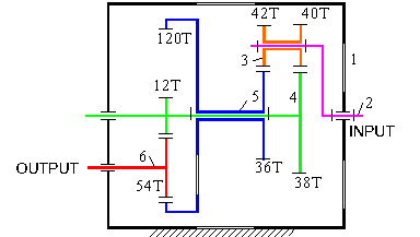 A speed changer is shown. The input speed is 1800 rpm. Determine the output speed and state its relative direction of rotation with respect to the input link. In the first portion of the gear train (links 2, 3, 4 and 6) the gears have a fixed axis of rotation. Therefore: