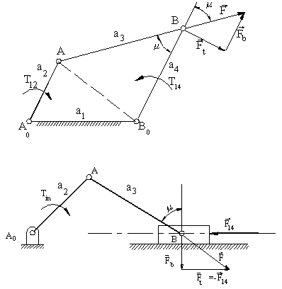 It is rather important to understand how the mechanism will function under loaded conditions in practice while the kinematic characteristics of the mechanism is being considered. By the performance of the mechanism we mean the effective transmission of motion (and force) from the input link to the output link. This also means that for a constant torque input, in a well performing mechanism we must obtain the maximum torque output that is possible and the bearing forces must be a minimum. Of course, torque and force are not the quantities that has been in the kinematics and whatever kinematic quantity we use to define the performance of the mechanism, this quantity will only approximate the static force characteristics of the mechanism. The dynamic characteristics, which is a function of mass and moment of inertia of the rigid bodies, may be several times more than the static forces and the behaviour of the mechanism under the dynamic forces cannot be predicted by kinematics. Still, some rule-of-thumb of the behaviour of the mechanism under load is better then none. Alt defined the transmission angle as: