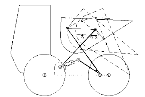 c) The positions of the coupler-link may be used as the output of the four-bar mechanism. As shown in figure below, the four-bar mechanism used for the dump truck requires that the center of gravity of the dumper to move on an inclined straight line while it is being tilted (why?).