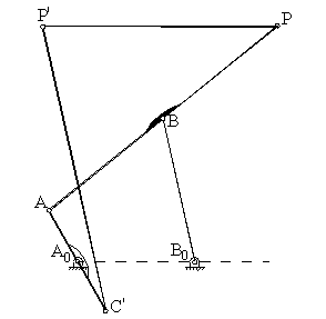 The given procedure locates both the orientation and the lengths of the links for all the four-bar cognates. A simpler construction for determining the link lengths is to stretch the four-bar mechanisms such that A0ABB0 lie on a straight line, since the theorem is also valid for an immovable four-bar with a new fixed link length a’1=a2+a3+a4. Application of the above steps to such a configuration for determining its cognates is quite simple as shown in the figure. One can then determine the location C0 of the original configuration by noting