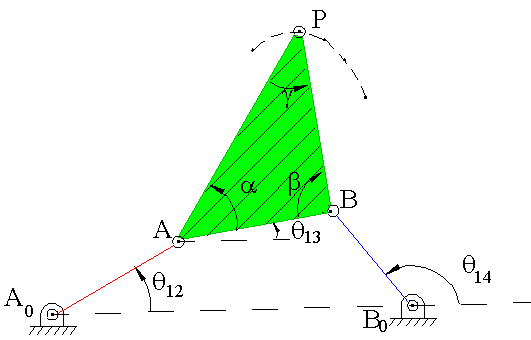 The location of coupler point, P, for any crank angle q12 can be determined from the equations: