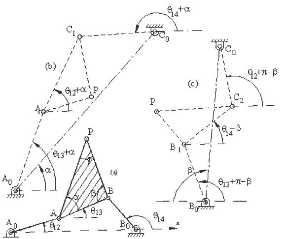 When our concern is only the path traced by the coupler point of a four-bar or a slider-crank mechanism, we can determine other four-bar or slider-crank mechanism proportions that generate identically the same coupler point curve. The four-bar mechanisms that generate the identical coupler point curve are known as the cognates of a four-bar. Let us state a theorem and show how the cognates of a four-bar and slider crank mechanism can be found.