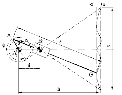 The coupler point, G, can be on a straight line only at six positions. The maximum deviation, x, is minimised using Chebyshev Theorem (which is beyond the topic). This procedure yields the relations between the link lengths, stroke s, corresponding crank rotation y, and the maximum deviation x. Using the nomenclature given on the figure these equations are: