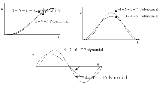 3-4-5 and 4-5-6-7 polynomials are compared in the above figure. Although 4-5-6-7 polynomial has zero jerk and finite fourth order characteristics. However, note that the maximum velocity and acceleration within the rise period has increased. This must also be taken into account.