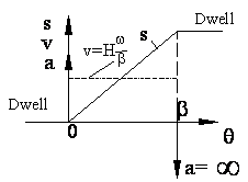 The motion curve and velocity and acceleration curves are as shown. Note that the acceleration is zero for the entire motion (a=0) but is infinite at the ends. Due to infinite accelerations, high inertia forces will be created at the start and at the end even at moderate speeds. The cam profile will be discontinuous.