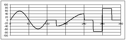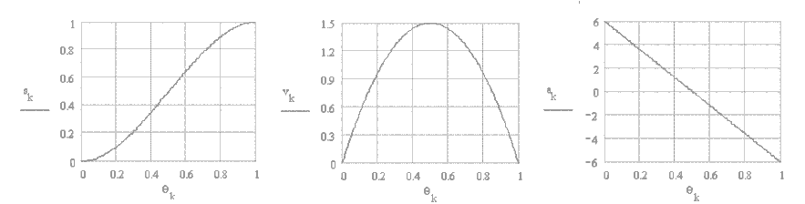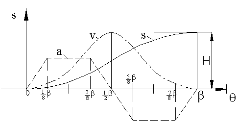 The displacement, velocity and acceleration curves are as shown. Note that although the displacement and velocity curves are continuous and the acceleration curve is finite, the third motion derivative (jerk) will be infinite at all the transition points. This motion curve can only be used for low speeds.