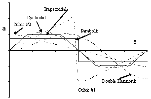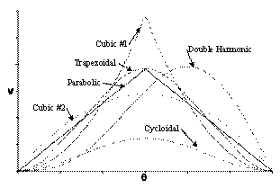 There are different methods used in generating motion curves satisfying the certain requirements. Note that for dwell-rise-return cams the main requirement is that there must be continuity of motion and its derivatives (velocity and acceleration). The displacement diagrams of the curves If we compare the displacement of the motion curves shown till now, one can see that there is very little difference . However when we compare the velocity and acceleration of these curves, large differences can be seen. Due to the difference in acceleration, dynamic characteristics will all be different.
