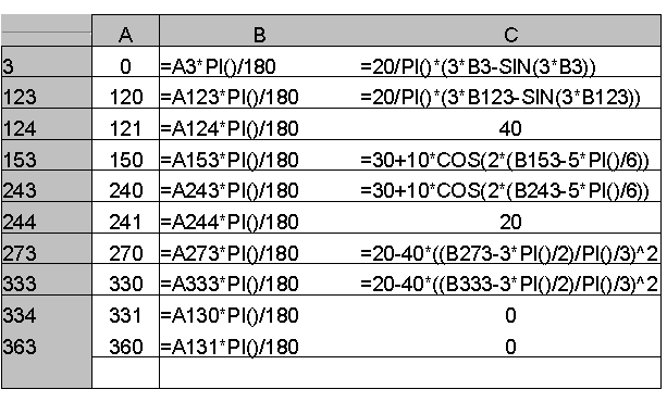 Using Excel the cam motion curve is drawn as shown in Figure 8.35. In Figure 8.34 the formula written excel cells are shown. In column A we enter cam angles from 0 (Cell A3) to 360 (cell A363) in degrees. In column B we convert these angles into degrees and in Column C, in rows 3 to 123 we have the formula for a cycloid, in rows 124 to 152 dwell at s=H= 40 mm etc.