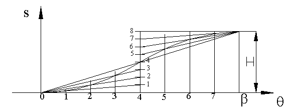Also assume when s = 0 q = 0 (rise is to start when t=0). With this assumption when s = H , q = b. when these boundary conditions are applied to the linear equation: a0=0 and a1=Hw/b. The linear motion curve is: